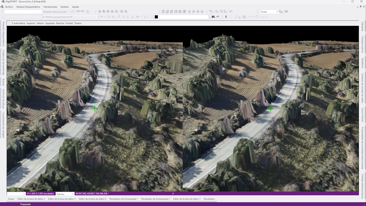 La ventana fotogramétrica a parte de cargar modelos estereoscópicos también admite modelos monoscópicos como cargar una ortofoto mostrando la superimposicion vectorial en tiempo real.